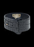 Materials: Bonded Leather, Nickel-Free Metal Color: Black with Iridescent Hardware Dimensions: Adjustable; one size fits most